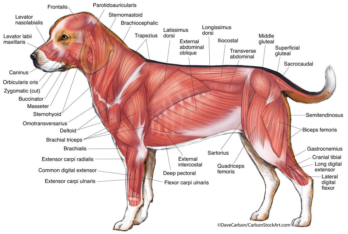 I muscoli del cane di cui ci occupiamo in questa sede sono quelli volontari. Ogni muscolo di compone di due parti: